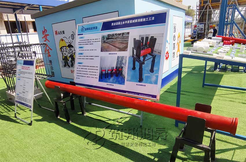 在觀摩會(huì)現(xiàn)場(chǎng),還有一個(gè)紅色圓柱外形的東西吸引了眾多觀摩人員的注意。湖南教建集團(tuán)有限公司國(guó)欣向榮廣場(chǎng)項(xiàng)目項(xiàng)目總指揮長(zhǎng)李海平介紹,這是其公司自創(chuàng)的泵送混凝土水平泵管減振消磨施工工法。該工法運(yùn)用的關(guān)鍵在于利用鋼筋、鋼板、滾筒、軸承等制作一種減振支架作為混凝土輸送水平泵管的支座,以減少在混凝土泵送過(guò)程中泵管振動(dòng)對(duì)已綁扎好的鋼筋骨架、模板的影響。