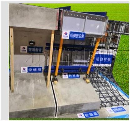 工藝展示:砼墊層,站臺(tái)墻帽,穿墻套管,鋁模板安裝,鋼筋綁扎,斜坡道,伸縮縫。
